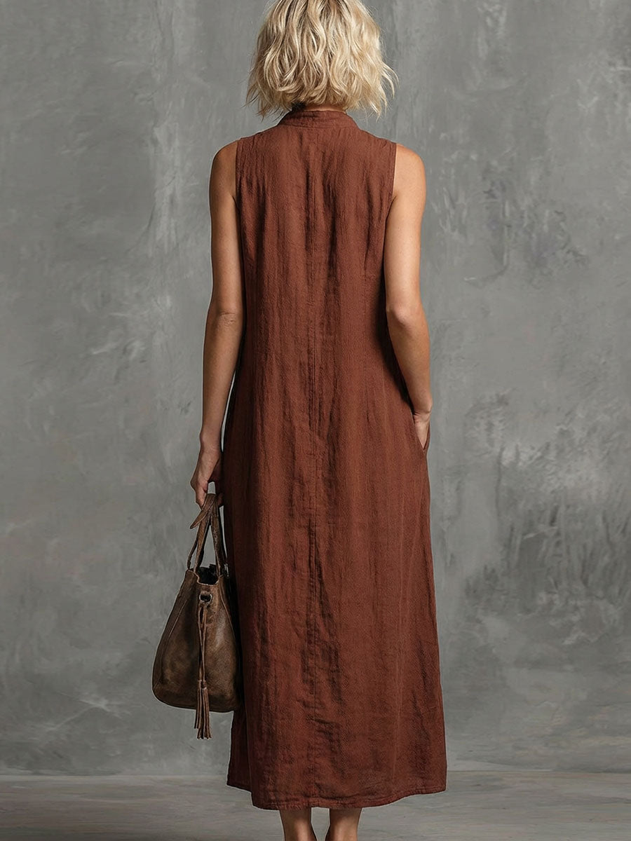 Women's Solid-color Stand-collar Sleeveless Loose-fit Cotton-linen Casual Dress