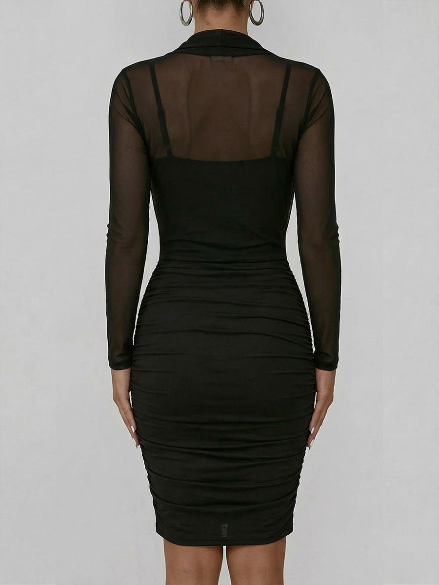 Women's Solid-Color Cowl Neck Long-Sleeve Stretchy Mesh Bodycon Dress